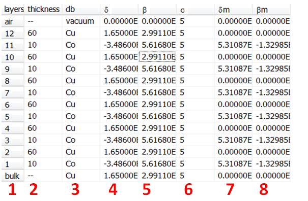 - Filename of the optical constants database files without ending (here Co.db, Cu.db, and vacuum.db). Files have to be in the same directory as the .all file.