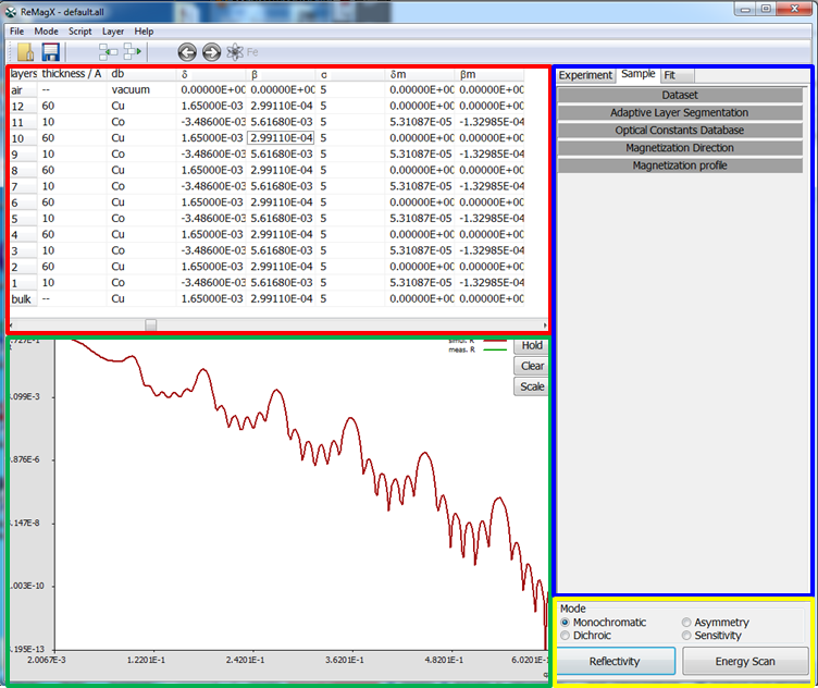 blue: Settings Tabs - control of the simulation, experiment, fit, etc. parameters